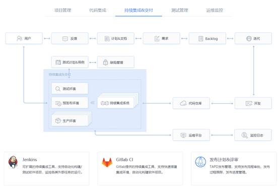 TAPD提供看板、在线文档、敏捷需求规划、迭代计划&跟踪、任务工时管理、缺陷跟踪管理、测试计划&用例、持续集成、持续交付&部署等丰富的可配置功能,并提供三种敏捷协作解决方案,满足不同客户场景需要: