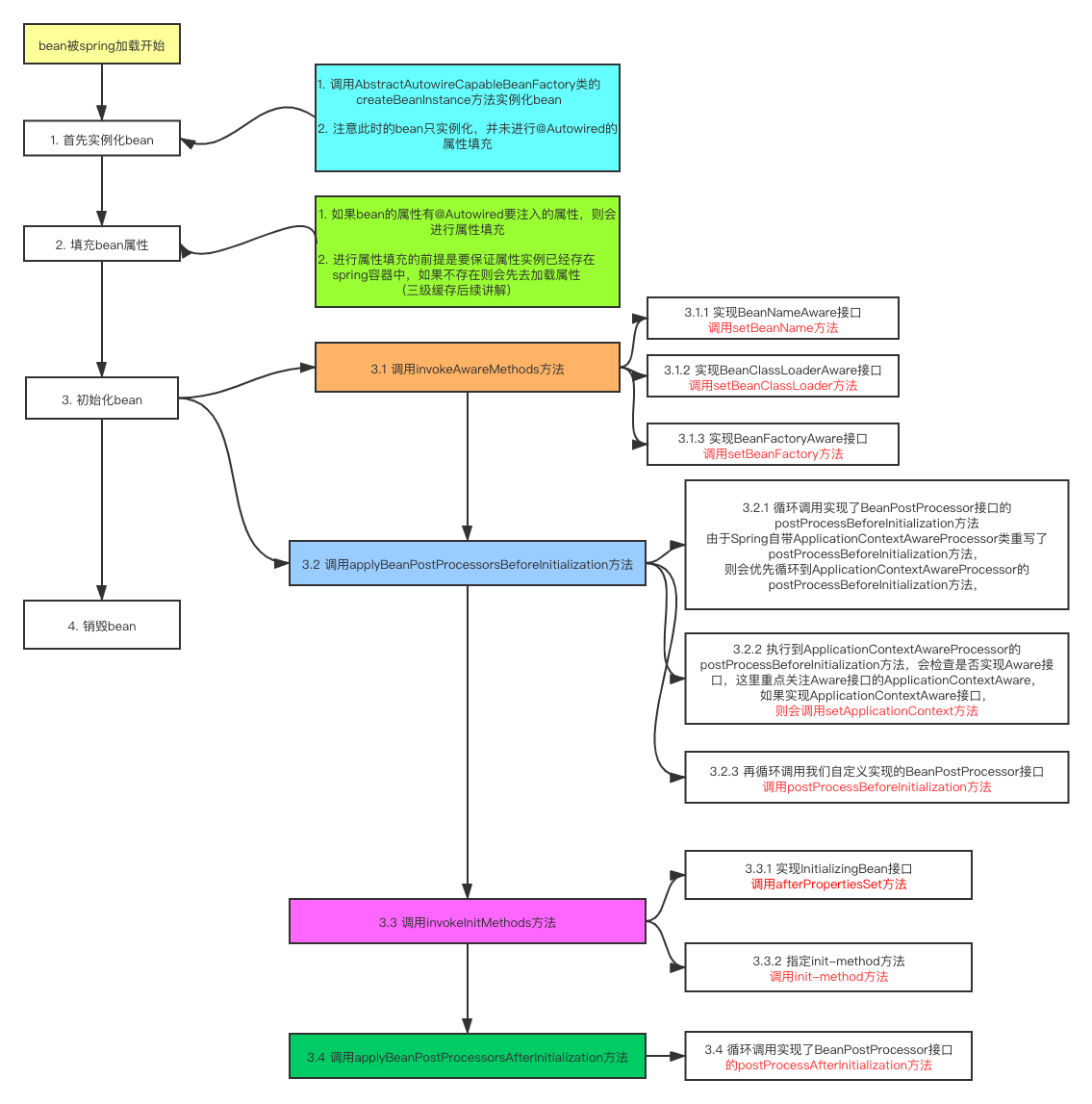 BeanDefinition对象实例化成具体的bean对象 bean对象的初始化过程(填充属性,调用aware子类的方法,调用BeanPostProcessor前置处理方法,调用init-method方法,调用BeanPostProcessor的后置处理方法)- 生成完整的
